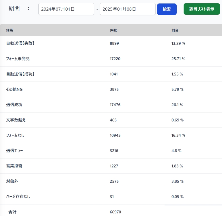 結果の登録完了日時の期間で集計ができ、その完了日時を含む該当リストを営業一覧で表示が可能です。